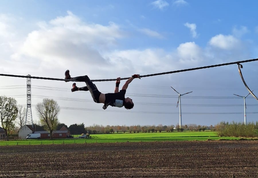 Adegem is known for its unique obstacles. Everything is knotted with rope and on ropes, making every obstacle bouncy. If you climb into them with several people, you’re guaranteed to be launched when someone else jumps out. Besides, the obstacles are quite… unique? Have you ever done a swing-over with a sandbag around your neck? Or a swing-over from a triangle? This demands some technique but mostly tests brute strength. With a slight lead, I entered this obstacle feast. A series of swing-overs, and even more combinations. This isn’t my strongest point and Michael passes me, gradually increasing his lead.